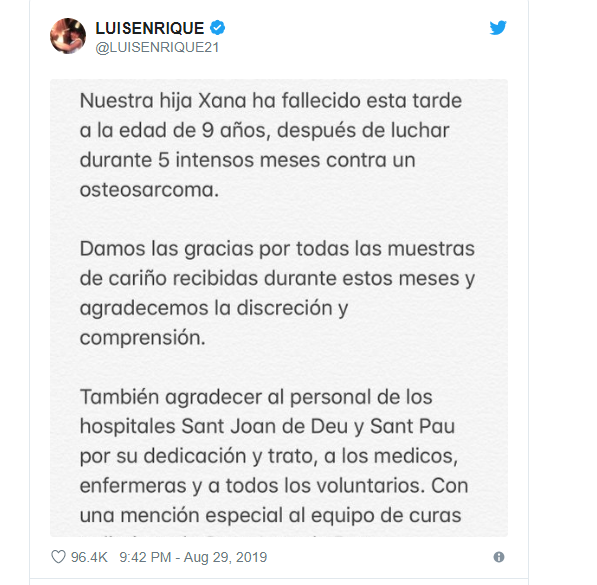 Ish trajneri i Barçës dhe  i Spanjës, Luis Enrique ka treguar lajmin tragjik që vajza e tij nëntë vjeçare e cila kishte vuajtur nga kanceri në eshtra ka vdekur pas një beteje me kancer pesë muaj