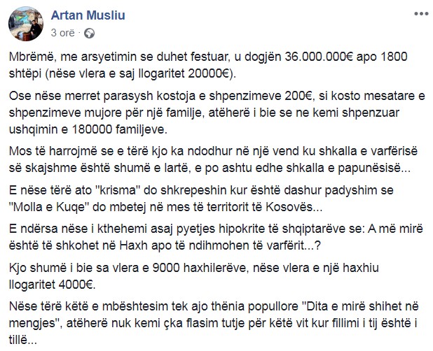 Ose nëse merret parasysh kostoja e shpenzimeve 200€, si kosto mesatare e shpenzimeve mujore për një familje, atëherë i bie se ne kemi shpenzuar ushqimin e 180000 familjeve.