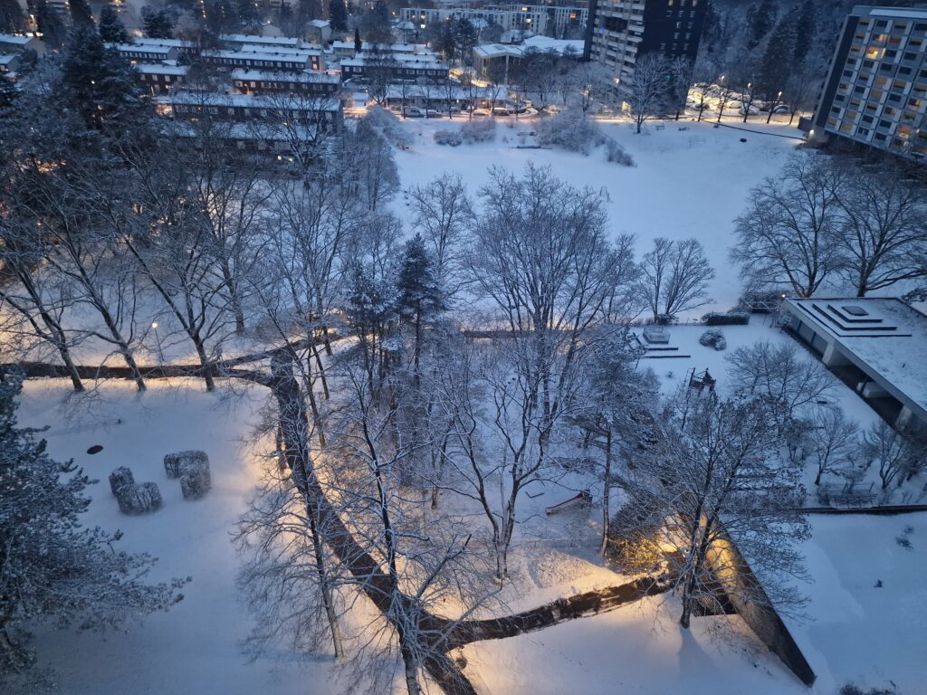 Atmosfera në Lagje: Pemët e zhveshura janë veshur me „pambukun“ e bardhë, ndërsa shtigjet e këmbësorëve në parkun poshtë dritares suaj dallohen qartë falë ndriçimit të ngrohtë të fenerëve, duke krijuar një kontrast të bukur mes të ftohtit blu të natës dhe dritës së verdhë.