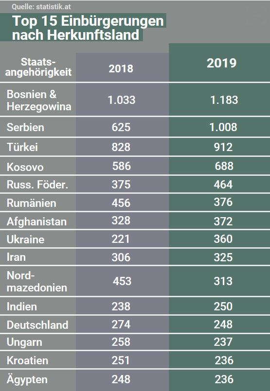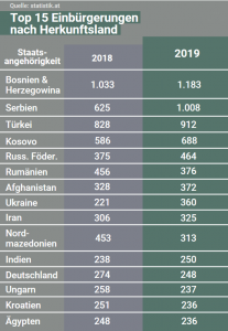 „Statistik Austria“ të enjten i bëri publike shifrat aktuale të natyralizimit për vitin 2019. Në krahasim me vitin 2018, kishte 12.2 për qind më shumë persona që u bënë austriakë sesa në vitin 2018.