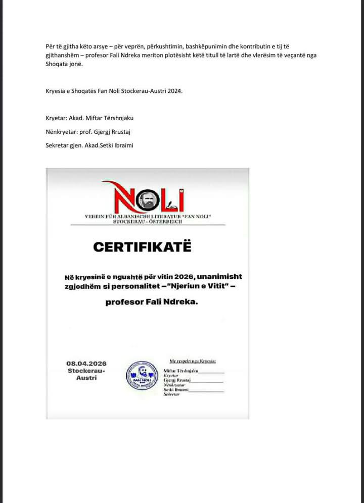 Zgjedhja e tij si “Njeriu i Vitit 2026” nga Shoqata jonë nuk është vetëm një vlerësim për veprën e tij të pasur, por edhe një shprehje mirënjohjeje për përkushtimin e tij të vazhdueshëm ndaj Shoqatës së Literaturës Shqiptare “Fan Noli”. Profesor Fali Ndreka ka qenë gjithmonë pranë nesh me këshilla të vyera, me sugjerime konkrete dhe me gatishmëri të plotë për bashkëpunim.