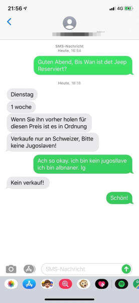 Mein Freund (Albaner) wollte ein Auto kaufen und hat an einem Schweizer ganz normal eine Nachricht geschickt. Sowas kam zurück. Wir waren geschockt. Warum nur?